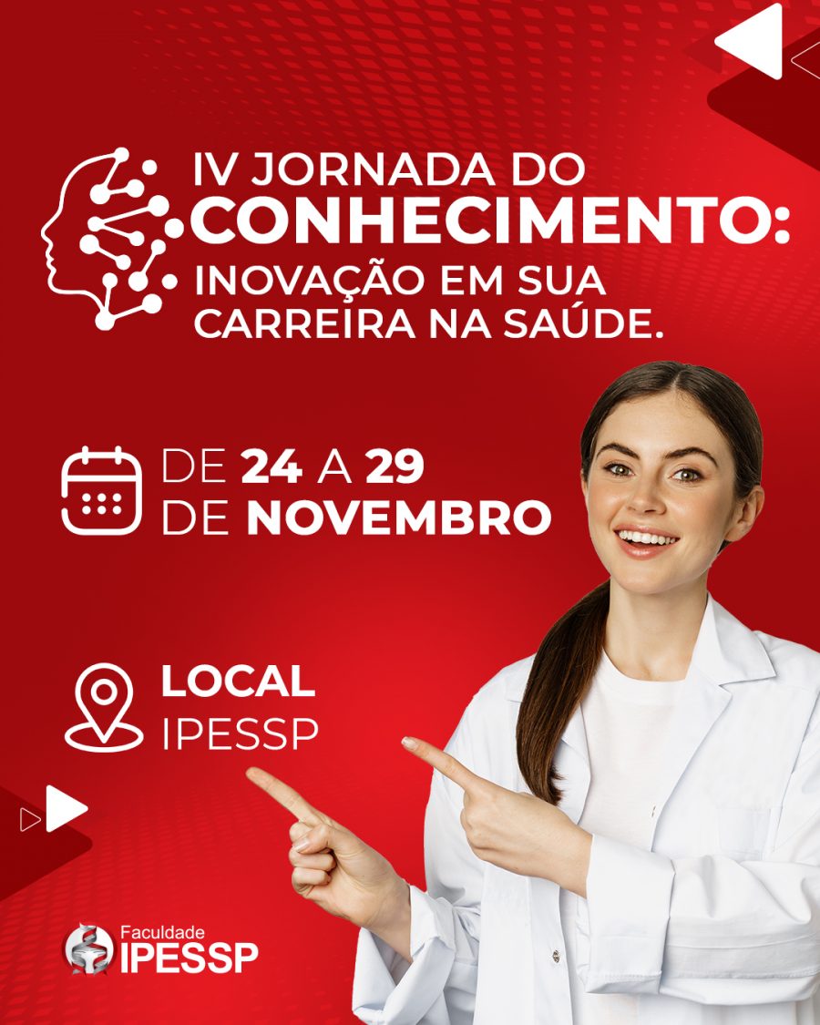 Estamos animados para anunciar a “4ª Jornada do Conhecimento: Inovação em sua Carreira na Saúde”, um evento que reunirá o melhor da teoria e prática no campo da saúde! De 24 a 29 de novembro de 2025, a partir das 19h, o IPESSP será o palco para uma série de palestras e minicursos projetados para expandir o conhecimento dos nossos alunos e promover um excelente networking.